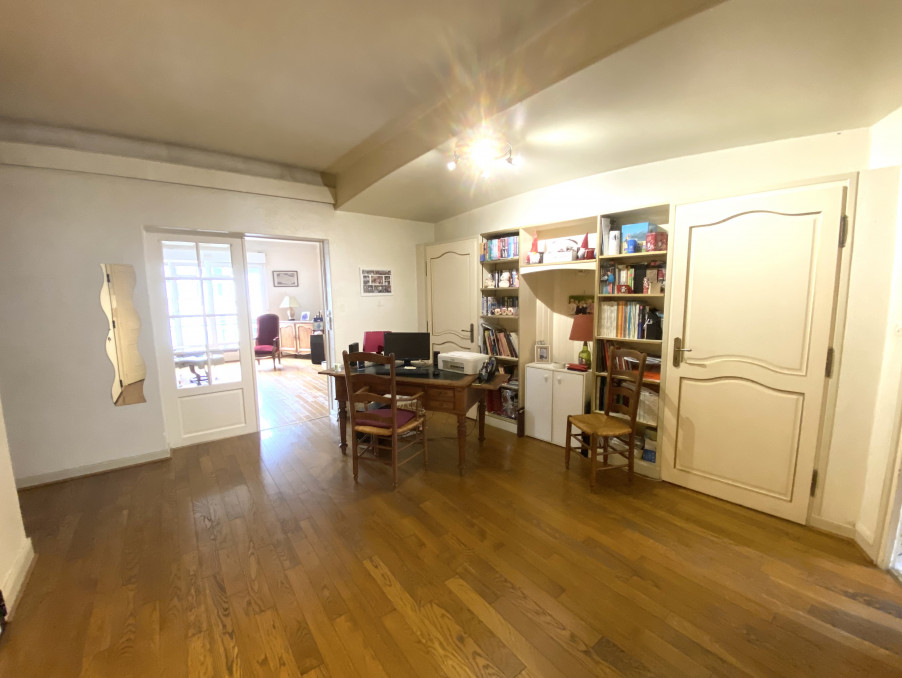 une entrée / bureau de 23m², un superbe séjour lumineux de 50m² avec insert bois, une cuisine aménagée et équipée de 13m², un WC avec coin laverie, une salle de douche avec wc et trois chambres (13, 16 et 21m²) dont 2 avec placards.