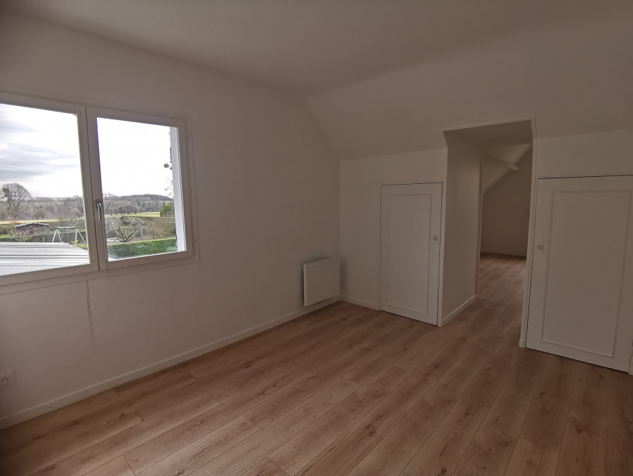 Étage (dalle béton) : un palier, deux chambres, un bureau, une pièce de stockage et une salle de bains (douche et baignoire)