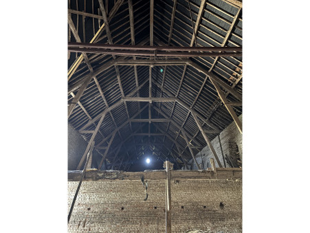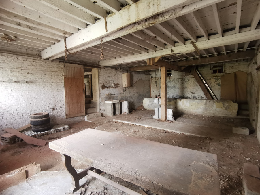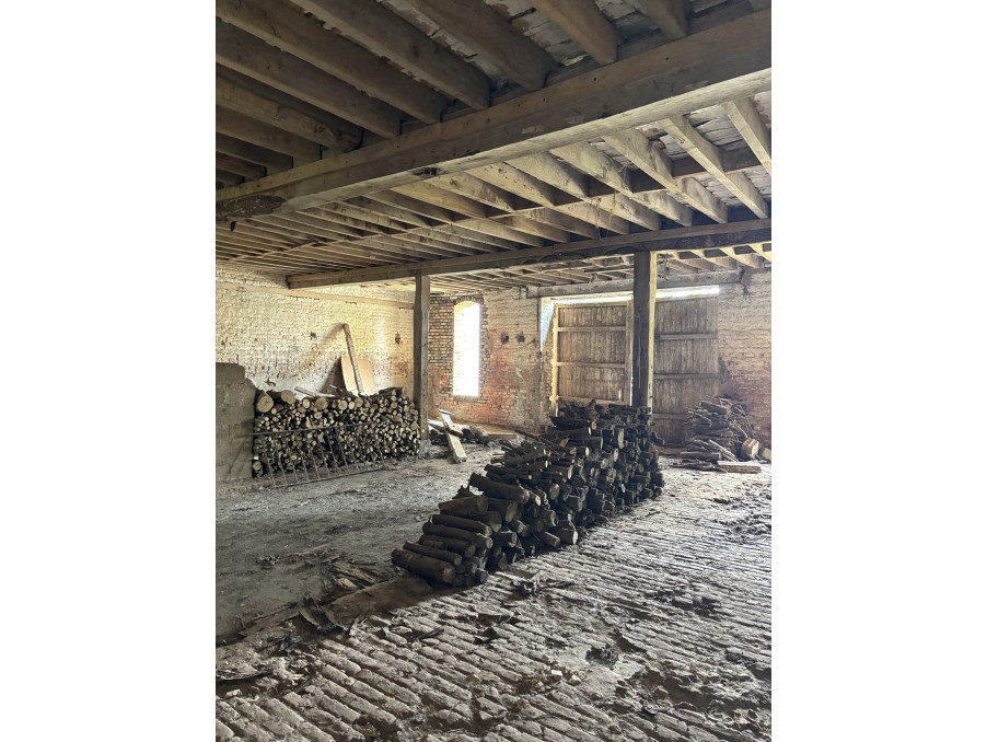 Bâtiment en briques de 1 360 m² sur 2 niveaux, avec grand volume sans cloison (accès engins agricoles), 2 garages, anciennes écuries, plusieurs pièces de stockage